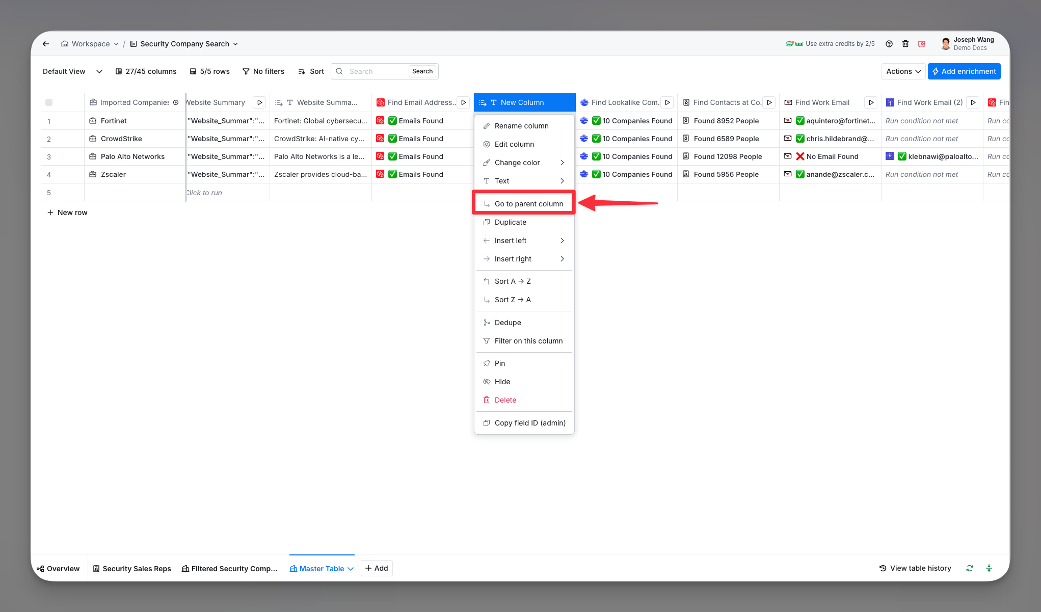 You can identify the parent column of a child column to better understand its data context. Follow these steps: